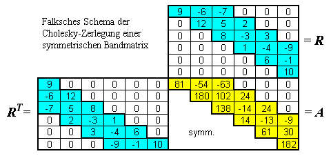 In Zeile 7 wird die (symmetrische und postiv definite) Koeffizientenmatrix in das Matlab-"Sparse Matrix"-Format umgewandelt, in Zeile 9 wird die Cholesky-Zerlegung ausgeführt. Rechts sieht man die beiden Belegungsmuster der (symmetrischen) Ausgangsmatrix und der nach Cholesky erzeugten Rechtsdreiecksmatrix. Deutlich sieht man, dass sich die "Schornsteine" (wie oben beim Skyline-Verfahren beschrieben) weitgehend gefüllt haben.