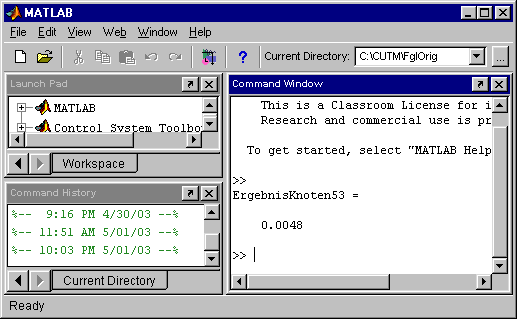 In diesem Fenster wird Debug | Run gewählt. Möglicherweise öffnet sich ein Fenster “MATLAB Editor”, in dem man das Angebot “Change MATLAB current directory” annehmen sollte. Danach wird die Rechnung