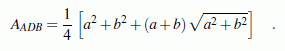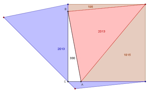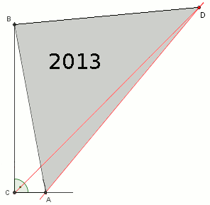 Der neue Punkt D wird mit dem Punkt B des rechtwinkligen Dreiecks verbunden, und die Überraschung ist: Das Dreieck ADB hat den Flächeninhalt 2013. Der Wert ist exakt, man kann ihn nachrechnen. Nach etwas mühamer Rechnung erhält man eine Formel für die Dreiecksfläche, die für ein rechtwinkliges Dreieck mit beliebigen Katheten a und b gilt: