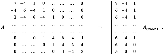 Im Skript “Biegeschwingungen gerader Träger” wird schließlich noch darauf verwiesen, dass die symmetrische Matrix A Bandstruktur besitzt und die gesamte Information in der Hauptdiagonalen und zwei Nebendiagonalen enthalten ist. Es ist eine wie eine Matlab-Function aufrufbare DLL isiasb_m verfügbar, die die Bandstruktur der beiden Matrizen ausnutzen kann (Speicherplatz und Rechenzeit werden gespart). Die Matrix A wird als symmetrische Bandmatrix folgendermaßen gespeichert: