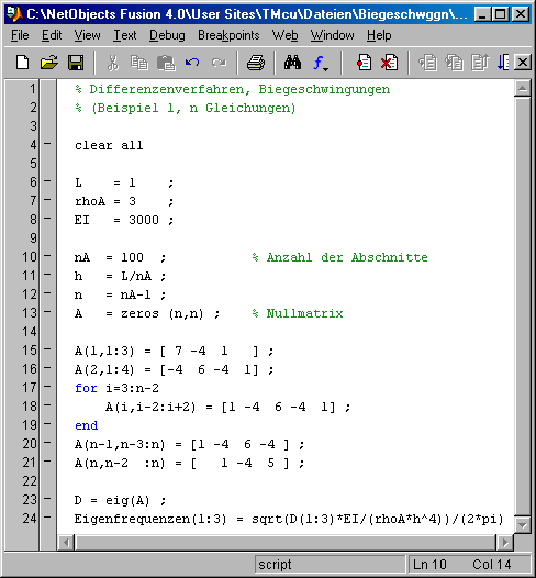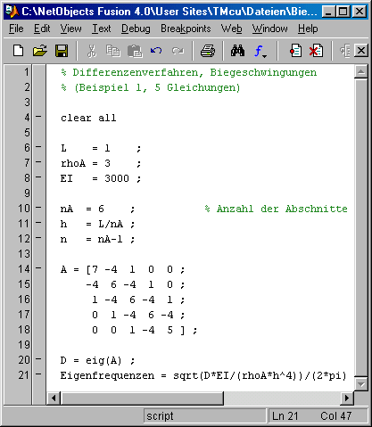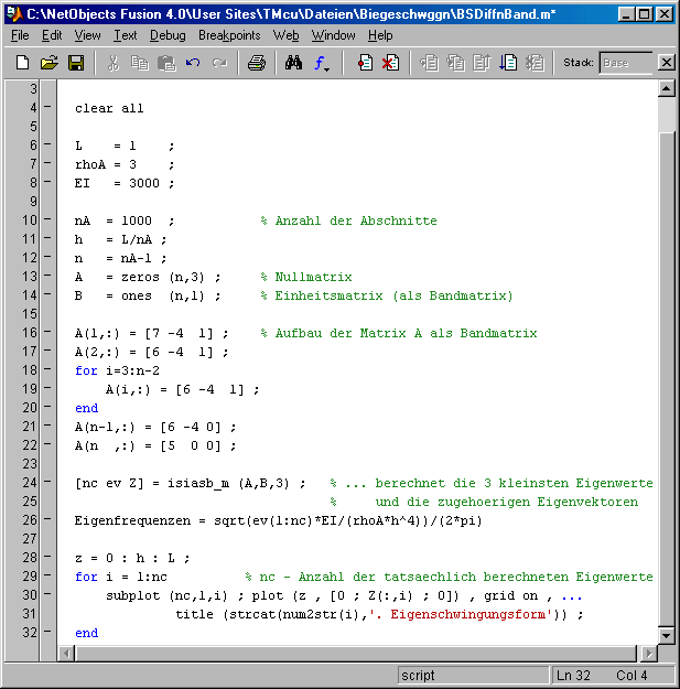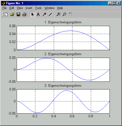 Das nebenstehend zu sehende Matlab-Script realisiert diese Berechnung. Die Matrix A wird als Bandmatrix mit n Zeilen und 3 Spalten aufgebaut, die Matrix B wird mit der Matlab -Function ones (Zeile 14) als Spaltenvektor definiert, der gleichzeitig mit 1-Elemementen gefüllt wird. Der Aufruf (Zeile 24) [nc ev Z] = isiasb_m (A,B,3) ; übergibt die beiden Matrizen und fordert mit der 3 als drittem Parameter die 3 kleinsten Eigenwerte und die zugehörigen Eigenvektoren an. Abgeliefert wird die Anzahl der tatsächlich berechneten Eigenwerte nc, ein Vektor ev mit diesen Eigenwerten und die Matrix Z, die spaltenweise die zugehörigen Eigenvektoren enthält. Die ausführliche Beschreibung der Arbeitsweise und der Anwendungsmöglichkeitender Function isiasb_m (für Interessenten auch der Quellcode) und die für den Aufruf aus Matlab erforderliche DLL findet man unter www.JuergenDankert.de/MatlabFemset. Die von isiasb_m abgelieferten Eigenvektoren werden im Script (Zeilen 28 bis 32) zur graphischen Darstellung der Schwingungsformen genutzt.