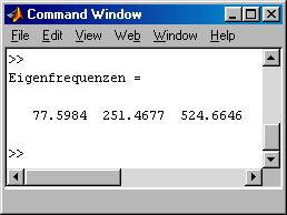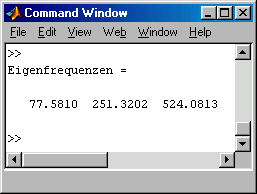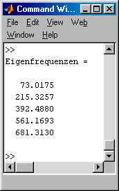 Die 1. Eigenfreuenz nähert den exakten Wert sehr gut, die höheren Frequenzen sind bei dieser groben Diskretisierung erwartungsgemäß recht ungenau. Deshalb wird das Script verallgemeinert, so dass eine beliebig feine Diskretisierung möglich ist.