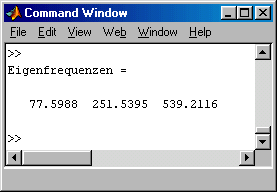 f(i) = sqrt(D(i,i)) / (2*pi) ; end [f , Index] = sort(f) ; if (m > 3) mm = 3 ; else mm = m ; end ; % Maximal 3 Eigenfrequenzen ausgeben ... Eigenfrequenzen = f(1:mm)