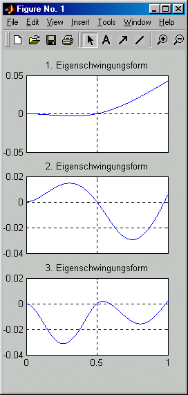 Im Skript “Biegeschwingungen gerader Träger” wird ausführlich beschrieben, wie das allgemeine Eigenwertproblem mit symmetrischen Bandmatrizen aufgebaut wird. Das nachstehend rechts zu sehende Matlab-Script realisiert die Berechnung. Bei einer Einteilung des Trägers in 4000 Abschnitte sind die Ergebnisse praktisch exakt: