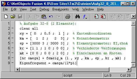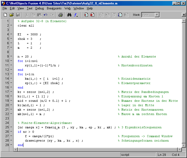 Das nebenstehende Matlab-Script zeigt den Aufbau der 5 Matrizen, die das Berechnungsmodell definieren: