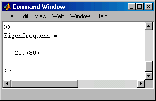 wird in das Command Window die Eigenfrequenz (bei der äußerst groben Elementeinteilung ist es nicht sinnvoll, mehr als eine Frequenz berechnen zu lassen).