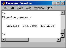 f(i) = sqrt(D(i,i)) / (2*pi) ; end [f , Index] = sort(f) ; if (m > 3) mm = 3 ; else mm = m ; end ; % Maximal 3 Eigenfrequenzen ausgeben ... Eigenfrequenzen = f(1:mm)