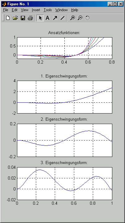 subplot(m+1,1,1) ; plot(zS , vS(:,1:m)) ; grid ; title('Ansatzfunktionen:') ;