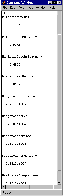 BiegemomentMitte = Mb (n/2+1) BiegemomentRechts = Mb (nS) MaximalesBiegemoment = max(abs(Mb))