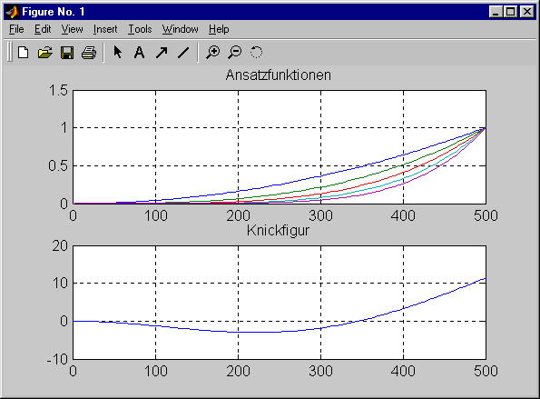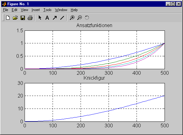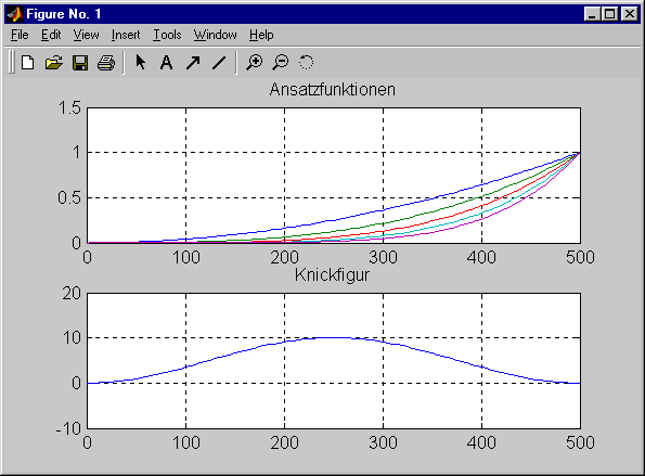 vSchlange = vS(:,1:m) * V(1:m,index) ; % Knickfigur zum kleinsten Eigenwert subplot(212) ; plot(zS , vSchlange) ; grid ; title('Knickfigur') ;