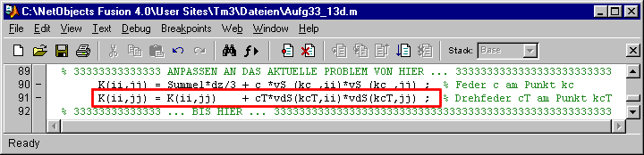 else faktor = 4 ; end ; end % 33333333333333 ANPASSEN AN DAS AKTUELLE PROBLEM VON HIER ... 3333333333333333333333333 K(ii,jj) = Summe1*dz/3 + c *vS (kc ,ii)*vS (kc ,jj) ; % Feder c am Punkt kc % K(ii,jj) = K(ii,jj) + cT*vdS(kcT,ii)*vdS(kcT,jj) ; % Drehfeder cT am Punkt kcT % 33333333333333 ... BIS HIER ... 333333333333333333333333333333333333333333333333333333 B(ii,jj) = Summe2*dz/3 ; end end