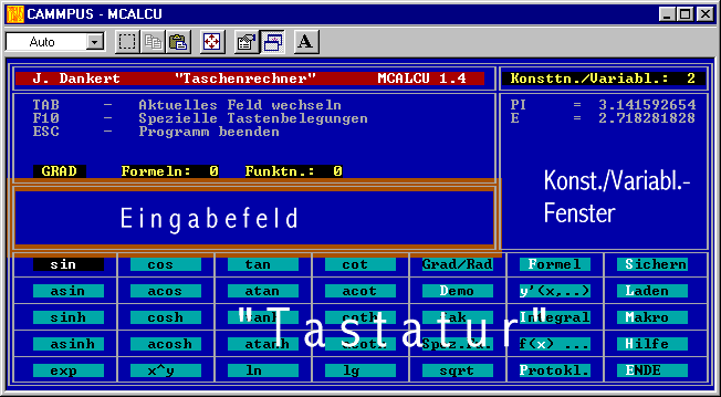 Tastenbelegungen: F10), am einfachsten sind sie jedoch mit der Maus auszuwählen. Die mathematischen Standardfunktionen, die man von der "Tastatur" in das Eingabefeld "holen" kann, können dort