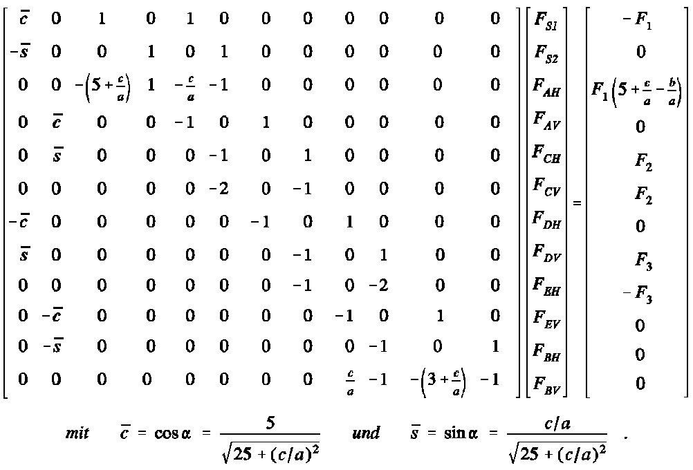 ersten drei Spalten der Matrix der rechten Seite B wird jeweils nur eine der drei Kräfte mit dem Wert 1 eingetragen, während die beiden anderen Kräfte den Wert Null haben (Rechnen mit "Einheits