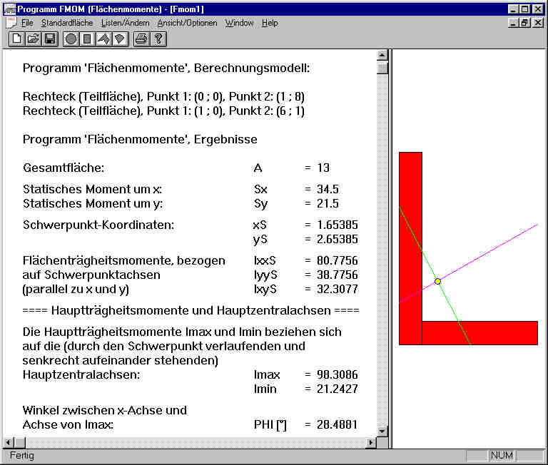 Der nachfolgende Bildschirm-Schnappschuss ist das Ergebnis der Berechnung mit dem Programm FMOM. Die Fläche wurde (genau wie bei der Rechnung auf der Seite 212) in zwei Rechtecke unterteilt (bei der Eingabe wurde a=1 gesetzt, so dass bei den Ergebnissen die Zahlenwerte der Koordinaten noch mit a, der Flächen mit a2, der statischen Momente mit a3 und der Flächenträgheitsmomente mit a4 multipliziert werden müssen): |