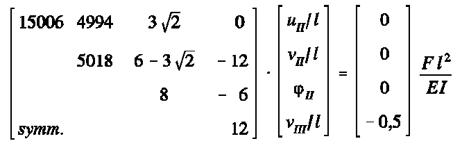 Auf den Seiten 283 und 284 wird gezeigt, dass für die Berechnung der Verformungsgrößen an den Knoten II und III des nebenstehenden Systems (Symmetriehälfte) das nachfolgende lineare Gleichungssystem gelöst werden muss: