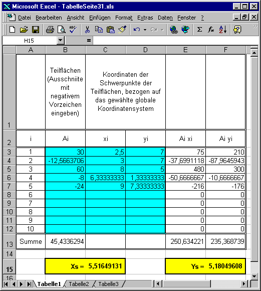 Die Schwerpunktberechnung mit der auf Seite 31 empfohlenen Tabelle kann natürlich automatisiert werden, z. B mit der Tabellen-Kalkulation Excel. Die nebenstehend zu sehende Tabelle (Download der