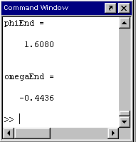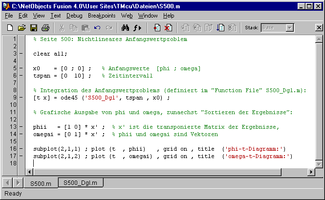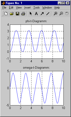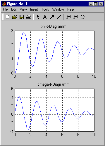 Beide Vektoren werden (neben dem Namen der Funktions-Datei, in der die Differenzialgleichungen definiert werden) der Funktion ode45 übergeben. Die Funktion liefert in der 1 . Spalte der Matrix x alle berechneten phi-Werte und in der 2. Spalte alle berechneten omega-Werte ab. Sie beziehen sich auf die Zeitpunkte, die im Vektor t abgeliefert werden. In den Scriptzeilen 13 und 14 werden die Ergebnisse auf separate Vektoren (durch Multiplikation der transponierten Ergebnis -Matrix mit Einheitsvektoren) übertragen, die in den Scriptzeilen 16 und 17 über der Zeit graphisch dargestellt werden.