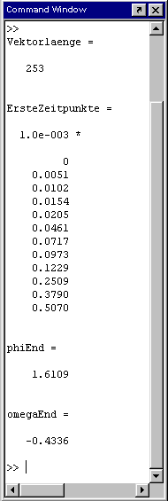 eingefügt. Die beiden Ergebnisse am Ende des Integrationsintervalls (für die reibungsbehaftete Bewegung) entsprechen den auf Seite 500 angegebenen, die dort mit der einfacheren Runge-Kutta -Formel (und konstanter Schrittweite) berechnet wurden, sind allerdings erstaunlicherweise ungenauer. Dies überrascht in doppelter Hinsicht, denn die Dormand-Prince-Formeln haben den Anspruch höherer Genauigkeit, und die damit mögliche Schrittweitensteuerung sollte einen weiteren Genauigkeitsgewinn bringen. Natürlich liegen die Abweichungen in akzeptablen Grenzen, aber die grundsätzlichen Warnungen auf Seite 498 gelten auch für die numerische Integration von Anfangswertproblemen mit MATLAB (auch bei Verwendung der anderen “Solver”, die MATLAB anbietet). Die (in ode45 realisierte) automatische Schrittweitensteuerung kann in der Regel nur lokal steuern (bemerkt also, wenn ein bestimmter Integrationsschritt kritisch ist). Die Empfehlung der Doppelrechnung mit unterschiedlichen Schrittweiten über das gesamte Intervall gilt also auch hier. MATLAB bietet dafür geeignete Optionen an, die man dem Solver (hier ode45) als zusätzlichen Parameter übergibt. Relativ einfach zu realisieren ist die “MaxStep”-Option (MATLAB-Help: “Positive scalar, an upper bound on the magnitude of the step size that the solver uses. The default is one-tenth of the tspan interval.” Die Optionen werden mit der Funktion odeset gesetzt. Für das behandelte Problem könnte dies z. B. so aussehen: