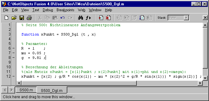 Eingangswerte sind ein Zeitpunkt t (einfache Variable) und die Funktionswerte zu diesem Zeitpunkt im Vektor x (phi als x(1) und omega als x(2)). Abgeliefert wird ein Spaltenvektor xPunkt mit den beiden berechneten Ableitungen. In Zeile 12 ist die Berechnung der Ableitungen zu sehen: Das erste Element “x(2)” entspricht der ersten Differentialgleichung “phiPunkt=omega”, das zweite Element “g/R*cos(x(1))-...” entspricht der zweiten Differentialgleichung “omegaPunkt=g/R*cos(phi)-...”.