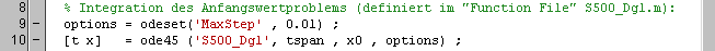 Es ist durchaus interessant, wie fein ode45 das Integrationsintervall unterteilt. Die beiden zusätzlichen Zeilen in S500.m