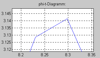 Um zu bestätigen, dass die numerische Rechnung über den Integrationsbereich “gesund” ist, wird die Rechnung mit mu=0 (Änderung der Zeile 7 in S500_Dgl.m) wiederholt, weil bei Reibungsfreiheit der Massenpunkt bei jeder Schwingung die Ausgangshöhe wieder erreichen muss. Das rechte Bild als Ergebnis dieser Rechnung lässt erkennen, dass offensichtlich sowohl Anfangslage als auch die Endlage (φ = π) stets wieder erreicht werden. |