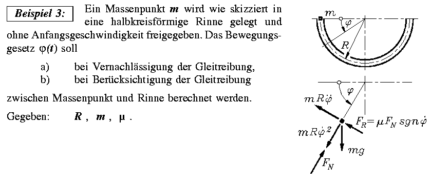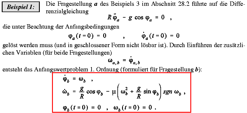 Auf der Seite 494 werden die Bewegungs-Differenzialgleichungen formuliert. Sie sind nichtlinear und können nicht in geschlossener Form gelöst werden. Das Problem wird auf der Seite 499 noch einmal aufgegriffen, die beiden Anfangswertprobleme werden formuliert: |