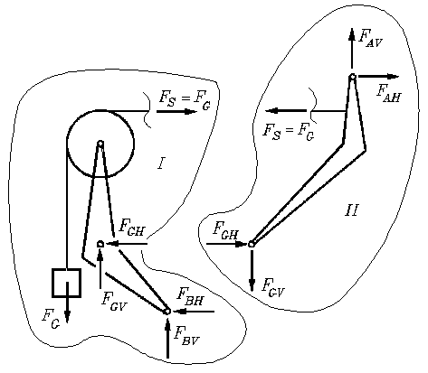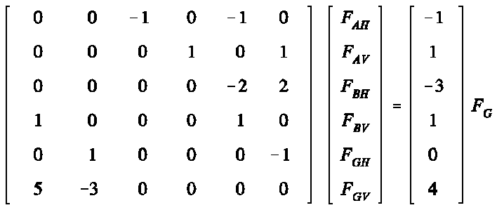 (zwei Gleichungen mit zwei Unbekannten) zu formulieren, aus denen die beiden Gelenkkraftkomponenten berechnet werden können, um danach auf recht einfache Weise die Lagerkraftkomponenten zu bestimmen. Bei der Benutzung des Computers sollte die Bemerkung auf Seite 63 (unten) beachtet werden: Einfache Gleichungen formulieren, weil eine entkoppelte Formulierung keine Vorteile bringt und bei den einfachen Bedingungen (an jedem Teilsystem jeweils zwei Kraft- und eine Momenten-Geichgewichtsbedingung) weniger Fehler zu erwarten sind. Man erhält z. B. dieses Gleichungssystem: