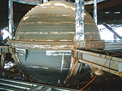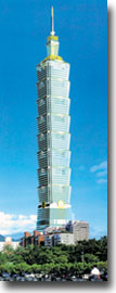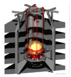 Das Pendel erstreckt sich über mehrere Etagen (schematische Darstellung rechts, siehe z. B. auch hier ), die vergoldete Kugel ist die Attraktion in dem “Restaurant über den Wolken”. |