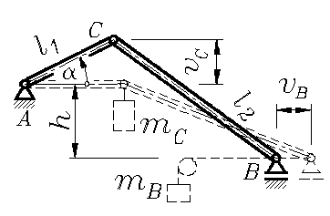 Auf Seite 625 wird gezeigt, dass die potentielle Energie des Systems bei (willkürlicher) Festlegung der im nebenstehenden Bild gestrichelt gezeichneten Lage als Zustand mit der potentiellen Energie Null folgendermaßen aufgeschrieben werden kann: |