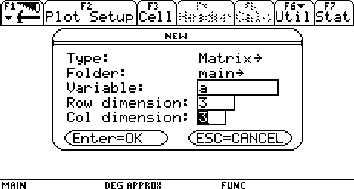 Dialogfenster “NEW” erscheint, folgende Eingaben werden vorgenommen (Matrix mit dem gewählten Namen a, 3 Zeilen, 3 Spalten): Type: Matrix Nach Drücken von “Enter” ... |