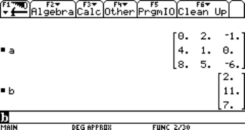 Zur Kontrolle sollte man sich die eingegebene Matrix und den eingegebenen Vektor noch einmal anzeigen lassen. Nach “A”, “Enter” und “B”, “Enter” zeigt das Display (nebenstehendes Bild) die eingegebenen Werte. |