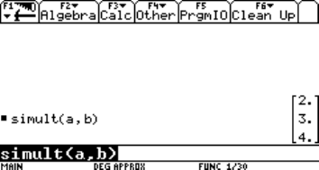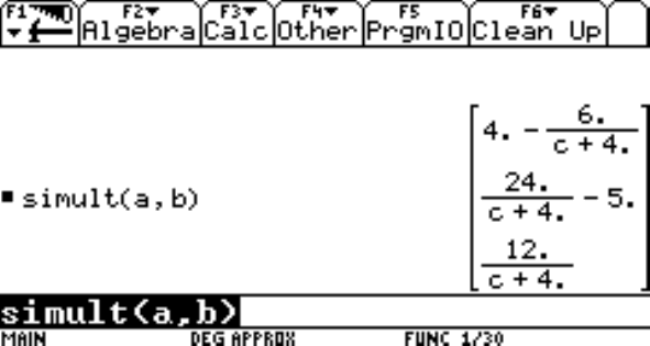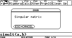 Mit dem Befehl simult(a,b) wird das lineare Gleichungssystem gelöst. Der Ergebnisvektor wird angezeigt. |