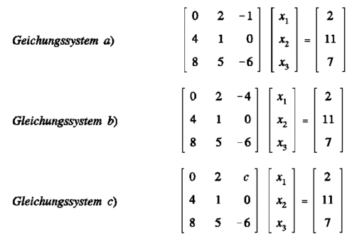 Gleichungssystem a) ist das Original von Seite 63, bei System b) ist nur der 3. Wert in der 1. Zeile von -1 auf -4 geändert worden. Im System c) steht auf dieser Position die nicht durch einen Zahlenwert spezifizierte Größe c, so dass dieses System nur von einem Programm behandelt werden kann, das “symbolische Mathematik” betreiben kann. |
